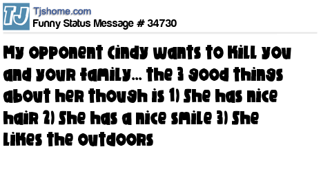 X My opponent Cindy wants to kill you and your family... the 3 good things about her though is 1) She has nice hair 2) She has a nice smile 3) She likes the outdoors