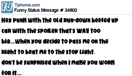 X is Hey punk with the old run-down beefed up car with the spoiler that's WAY too big....when you decide to pass me on the right to beat me to the stop light, don't be surprised when I make you work for it....
