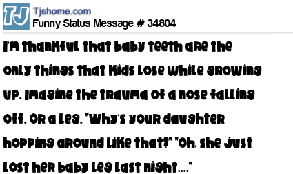 - # 30301 I'm thankful that baby teeth are the only things that kids lose while growing up. Imagine the trauma of a nose falling off. Or a leg. "Why's your daughter hopping around like that?" "Oh, she just lost her baby leg last night."