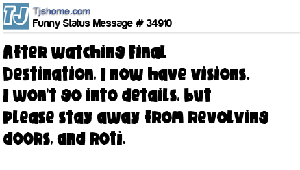 X After watching Final Destination, I now have visions. I won't go into details, but please stay away from revolving doors, and roti.
