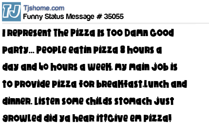 X I represent The Pizza Is Too Damn Good party... People eatin pizza 8 hours a day and 40 hours a week, my main job is to provide pizza for breakfast,lunch and dinner. Listen some childs stomach just growled did ya hear it?Give em pizza! Pizza Too Damn Good