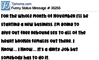 X is For the whole month of November I'll be starting a new business. I'm going to give out free rebound sex to all of the heart broken females out there. I know.... I know.... It's a dirty job but somebody has to do it.