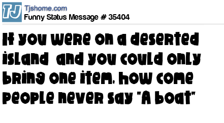 - # 23893 When asked "What would you bring with you to a deserted island", how come no one ever replies, "A boat."?