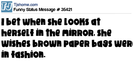 X I bet when she looks at herself in the mirror, she wishes brown paper bags were in fashion.