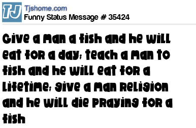 X Give a man a fish and he will eat for a day; teach a man to fish and he will eat for a lifetime; give a man religion and he will die praying for a fish