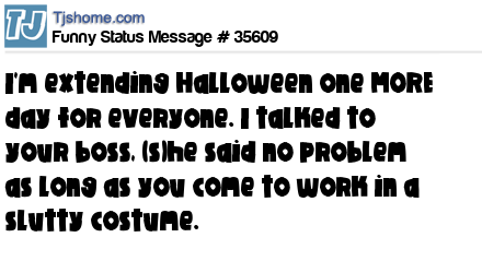X I'm extending Halloween one MORE day for everyone. I talked to your boss, (s)he said no problem as long as you come to work in a slutty costume.