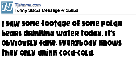 - # 54102 I saw some footage of some polar bears drinking water... it's obviously fake. Everybody knows they only drink Coca-Cola."