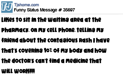- # 37154 likes to sit in the pharmacy on my phone talking about how I have a contagious rash on 90% of my body and the Dr. can't find a medicine that works!