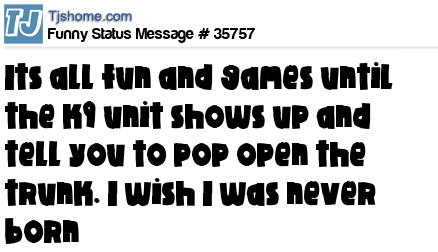 X is Its all fun and games until the k9 unit shows up and tell you to pop open the trunk. I wish I was never born
