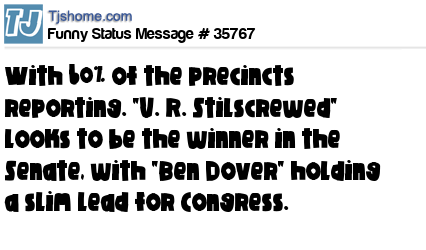 X is with 60% of the precincts reporting. "U. R. Stilscrewed" looks to be the winner in the Senate, with "Ben Dover" holding a slim lead for Congress.