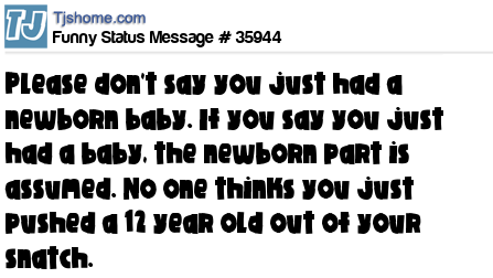 X  Please don't say you just had a newborn baby. If you say you just had a baby, the newborn part is assumed. No one thinks you just pushed a 12 year old out of your snatch.