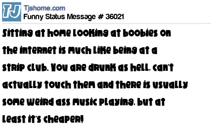 X Sitting at home looking at boobies on the internet is much like being at a strip club. You are drunk as hell, can't actually touch them and there is usually some weird ass music playing, but at least it's cheaper!