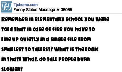 - # 32867 "In elementary school, in case of fire you have to line up quietly in a single file line from smallest to tallest. What is the logic? Do tall people burn slower?"
