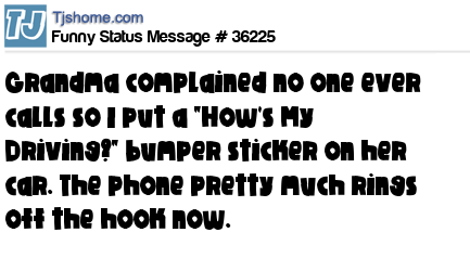 - # 166130 Grandma complained that no one ever calls, so I put a “How’s My Driving?” bumper sticker on her car…The phone pretty much rings off the hook now.