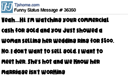 X Yeah....Hi, I'm watching your commercial cash for gold and you just showed a woman selling her wedding ring for $500. No, I don't want to sell gold, I want to meet her. She's hot and we know her marriage isn't working