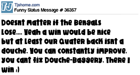 X Doesnt matter if the Bengals lose.... Yeah a win would be nice but at least our Quater back isnt a douche. You can constantly improve, you cant fix Douche-Baggery. There I win ;)