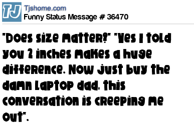 X says "Does size matter?" "Yes I told you 2 inches makes a huge difference. Now just buy the damn laptop dad, this conversation is creeping me out".