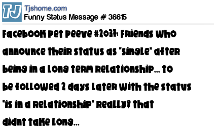 X says Facebook pet peeve #2037: Friends who announce their status as "single" after being in a long term relationship... to be followed 2 days later with the status "is in a relationship" really? that didnt take long...