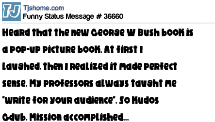 - # 36578 heard that the new GW Bush book is a pop-up picture book. Makes sense actually, an author always wants to meet the demographic/target audience.