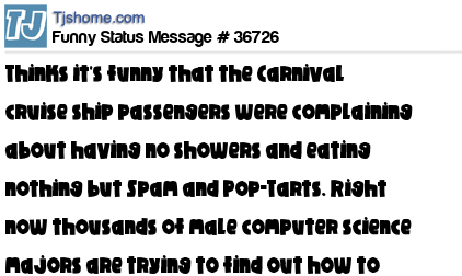 X thinks it's funny that the Carnival cruise ship passengers were complaining about having no showers and eating nothing but Spam and Pop-Tarts. Right now thousands of male computer science majors are trying to find out how to sign up for the next cruise.