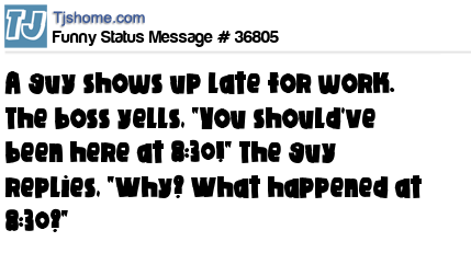 - # 79664 I showed up late for work today . The boss yells "You should have been here at 8:30!" ,,, I replied "Why? What happened at 8:30?"