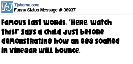 X Famous last words, "Here, watch this!" Says a child just before demonstrating how an egg soaked in vinegar will bounce.