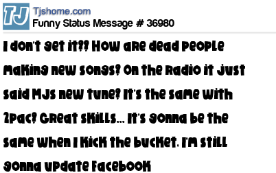 X I don't get it?? How are dead people making new songs? On the radio it just said MJs new tune? It's the same with 2pac? Great skills... It's gonna be the same when I kick the bucket, I'm still gonna update Facebook