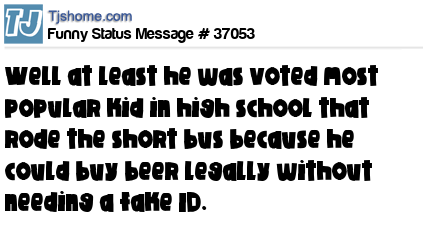 X Well at least he was voted most popular kid in high school that rode the short bus because he could buy beer legally without needing a fake ID.
