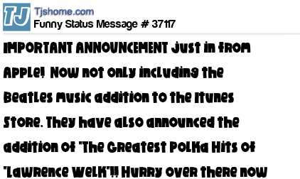 X says IMPORTANT ANNOUNCEMENT just in from Apple! Now not only including the Beatles music addition to the Itunes Store. They have also announced the addition of "The Greatest Polka Hits of "Lawrence Welk"!! Hurry over there now and get your digital copy now!