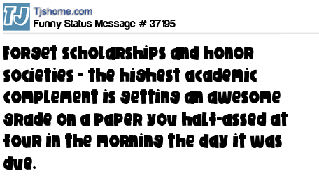 X Forget scholarships and honor societies - the highest academic complement is getting an awesome grade on a paper you half-assed at four in the morning the day it was due.