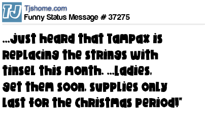 - # 10168 ...just heard that Tampax is replacing the strings with tinsel this month. ...Ladies, get them soon, supplies only last for the the Christmas period!