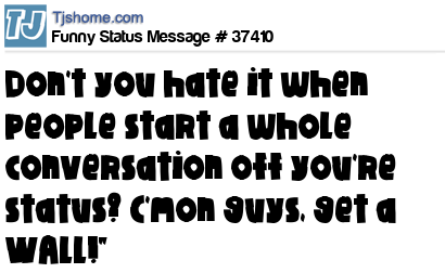 X is Don't you hate it when people start a whole conversation off you're status? C'mon guys, get a WALL!"