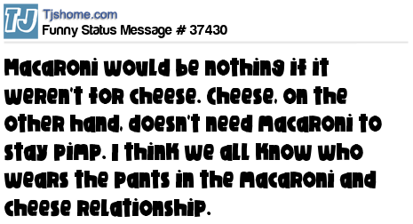- # 37427 Macaroni wouldn't be nothing if it weren't for cheese. Cheese, on the other hand, doesn't need macaroni to stay pimp. I think we all know who wears the pants in the macaroni and cheese relationship.