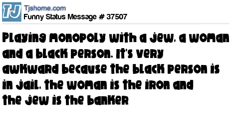 X Playing monopoly with a jew, a woman and a black person. It's very awkward because the black person is in jail, the woman is the iron and the jew is the banker