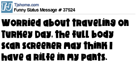 X is Worried about traveling on Turkey Day, the full body scan screener may think I have a rilfe in my pants.