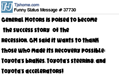 X is General Motors is poised to become “the success story” of the recession. GM said it wants to thank those who made its recovery possible: Toyota's brakes, Toyota's steering, and Toyota's accelerators!