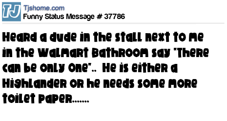 X Heard a dude in the stall next to me in the Walmart Bathroom say "There can be only One".. He is either a Highlander or he needs some more toilet paper.......