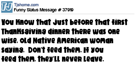 X  You know that just before that first Thanksgiving dinner there was one wise, old Native American woman saying, “Don't feed them. If you feed them, they'll never leave.