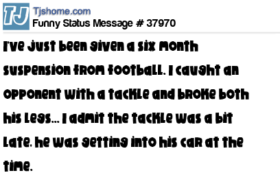 X I've just been given a six month suspension from football. I caught an opponent with a tackle and broke both his legs... I admit the tackle was a bit late, he was getting into his car at the time.