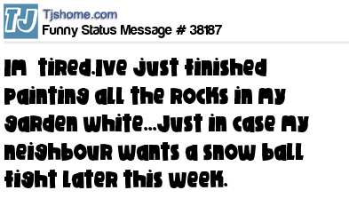 X Im tired.Ive just finished painting all the rocks in my garden white...Just in case my neighbour wants a snow ball fight later this week.