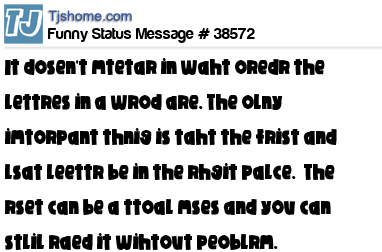 - # 27579 Aoccdrnig to a rscheearch at an Elingsh uinervtisy, it deosn't mttaer in waht oredr the ltteers in a wrod are, the olny iprmoetnt tihng is taht frist and lsat ltteer is at the rghit pclae. The rset can be a toatl mses and you can sitll raed it wouthit por