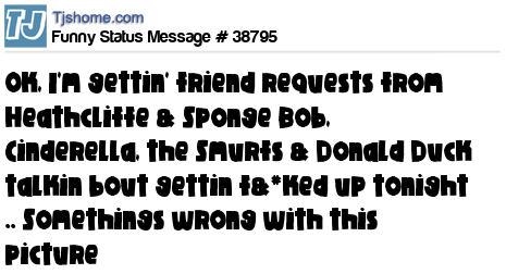 X says Ok, I'm gettin' friend requests from Heathcliffe & Sponge Bob, Cinderella, the Smurfs & Donald Duck talkin bout gettin f&*ked up tonight .. Somethings wrong with this picture