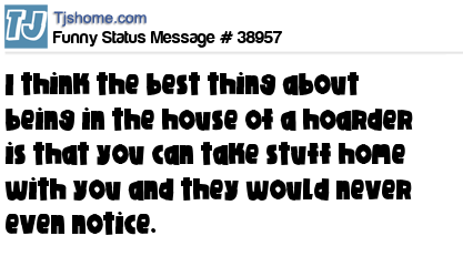 X I think the best thing about being in the house of a hoarder is that you can take stuff home with you and they would never even notice.
