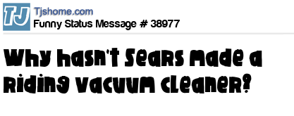 - # 131556 If husbands get riding lawn mowers why haven't they invented the riding vacuum? I have just as much carpet as we do yard. He tells me we have too much yard for a push mower so it only stands to reason that we have to much carpet for me to push vacuum! RIG