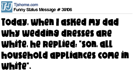 X says today, when I asked my dad why wedding dresses are white, he replied; "son, all household appliances come in white".