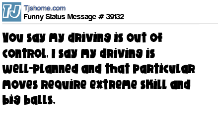 X You say my driving is out of control, I say my driving is well-planned and that particular moves require extreme skill and big balls.