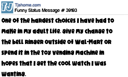X is One of the hardest choices I have had to make in my adult life, give my change to the bell ringer outside of Wal-Mart or spend it in the toy vending machine in hopes that I get the cool watch I was wanting.