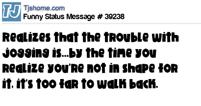 X Realizes that the trouble with jogging is...by the time you realize you're not in shape for it, it's too far to walk back.