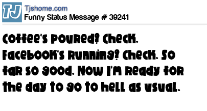 X Coffee's poured? Check. Facebook's running? Check. So far so good. Now I'm ready for the day to go to hell as usual.