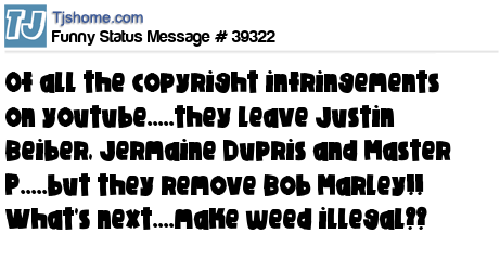X is of all the copyright infringements on youtube.....they leave Justin Beiber, Jermaine Dupris and Master P.....but they remove Bob Marley!! What's next....make weed illegal??